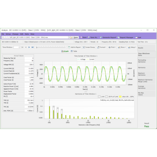 DPA 500N - plne kompatibilný jednofázový analyzátor harmonických a flikra. Harmonické a medziharmonické frekvencie sú spôsobené pokročilými elektronickými modulmi na úpravu výkonu. Tieto, väčšinou nelineárne, moduly na reguláciu záťaže a zníženie výkonu sú zdrojom napätia s nežiaducimi frekvenciami, ktoré sa superponujú na napájacie napätie. Kolísanie napätia spôsobené meniacimi sa záťažovými prúdmi môže ovplyvniť svietivosť alebo spektrálne rozloženie osvetľovacích systémov. Dojem premenlivosti vizuálneho vnímania spôsobený týmto svetelným podnetom sa nazýva blikanie. Analyzátor harmonických a flikru DPA 500N sa používa pre jednofázové aplikácie.