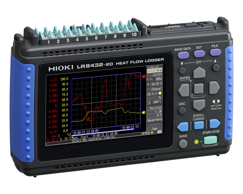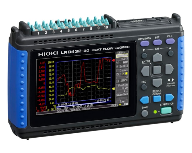 Záznamník údajov o tepelnej toku HIOKI LR8432 je variantom obľúbeného záznamníka údajov LR8431. Okrem funkcií a špecifikácií modelu LR8431 ponúka model LR8432 priamy vstup pre senzory tepelného toku, čím eliminuje potrebu ručného prevodu nameraných hodnôt napätia senzorov. Okrem toho má LR8432 namiesto 5 napäťových rozsahov 6 napäťových rozsahov, pričom dodatočný rozsah 10 mV umožňuje najmenšie rozlíšenie napätia 500 nV.